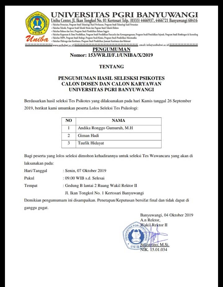 PENGUMUMAN HASIL SELEKSI PSIKOTES CALON DOSEN DAN CALON KARYAWAN UNIBA 2019