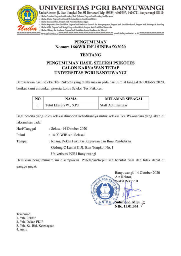 PENGUMUMAN HASIL SELEKSI PSIKOTES CALON KARYAWAN TETAP UNIVERSITAS PGRI BANYUWANGI